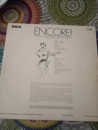 Disco de vinilo de José Feliciano, Encore!. Un álbum en excelente estado, con canciones como 'Light My Fire', 'California Dreamin'' y 'Rain'. - Incluye el álbum completo Encore! de José Feliciano. - Álbum de colección para amantes de la música latina.