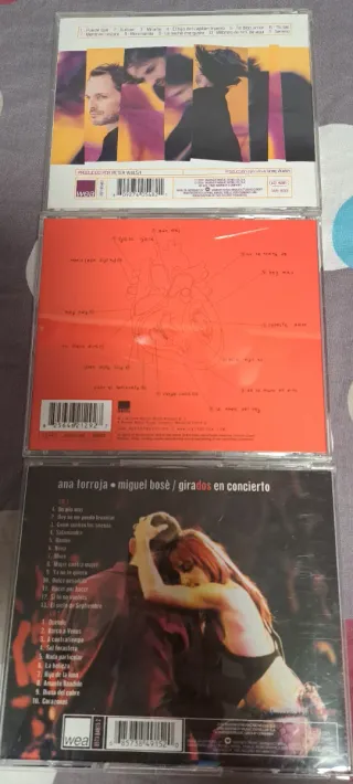 Lote de tres CDs del artista Miguel Bosé. - sereno condiciones aceptables - Velvetina muy buen estado - Gira dos en concierto (Ana Torroja y Miguel Bosé) Buen estado