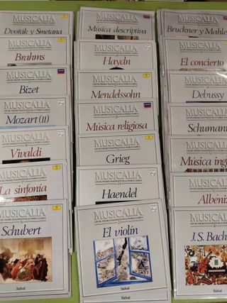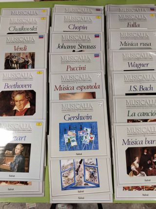Colección de 77 vinilos de la serie Musicalia, dedicada a los mejores fragmentos de la música clásica. Incompleta. Los números son: 1 al 39, 41, 43, 44, 46 al 52, 54 al 63, 66, 67, 69 al 72, 78 al 81, 83, 85,87, 89 al 94. - Incluye compositores como Chaikovski, Verdi, Beethoven, Mozart, Chopin, Johann Strauss, Puccini, Gershwin, Falla, Música rusa, Wagner y J.S. Bach. - Cada vinilo presenta una selección de obras destacadas. - Editado por Salvat. Recogida en Pozuelo de Alarcón o envío por Wallapop. Se venden juntos (115 euros) o por separado (5 euros por vinilo)