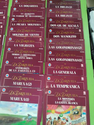Colección de 49 vinilos de La Zarzuela de Salvat. Incompleta. Los números son: 1 al 5, 8, 10 al 15, 17 al 31, 33, 34, 36 al 40, 42, 43, 45 al 47, 49 al 56, 58 y 59. - La Dogaresa - La Bruja (2) - La Bruja (1) - Don Gil de Alcalá - Don Manolito - Las Golondrinas (2) - Las Golondrinas (1) - La Generala - La Tempranica - La Montería / La Gatita Blanca - La Alsaciana / El Tambor de Granaderos - La Pícara Molinera - Molinos de Viento - La Viejecita - Moros y Cristianos / La Reina Mora - Antología de la Zarzuela (3) - Maruxa (2) - Maruxa (1) Recogida en Pozuelo de Alarcón o envío por Wallapop. Se venden juntos (145 euros) o separados (5€)