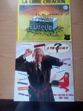 Lote de dos vinilos de música. - Por que a mi? es una colección de éxitos de DRO/GASA.15€ - Incluye temas de Los Coyotes, Siniestro Total, Duncan Dhu, Aerolíneas Federales, Manuel Illán, Los Nikis, Gatos Locos, Os Resentidos, Rey Lui, La Granja y Esclarecidos. - Bloque, la libre creación.10€