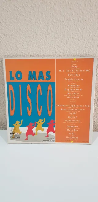 Doble LP de recopilatorio Lo Más Disco. - Incluye temas de artistas como SNAP, Guru Josh, Black Box, Depeche Mode, Technotronic, Twenty 4 Seven, DNA featuring Suzanne Vega, Jive Bunny, Betty Boo y 49ers. - Portada con diseño gráfico llamativo y figuras abstractas. - Anunciado en TV en 1990.