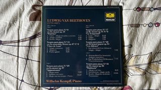 Conjunto de dos vinilos de Beethoven con sus sonatas predilectas para piano, interpretadas por Wilhelm Kempff. - Incluye las sonatas: 8, 14, 17, 21, 23 y 26. - Grabación de Deutsche Grammophon.