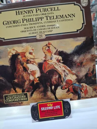 Disco de vinilo con obras de Henry Purcell y Georg Philipp Telemann. - Henry Purcell: Suites para orquesta. - Georg Philipp Telemann: Concierto para trompeta, cuerdas y continuo. - Intérpretes: Maurice André (trompeta), Orquesta de Cámara de Rouen, Albert Beaucamp. - Número de volumen: 21. - Colección: Enciclopedia Salvat de Los Grandes Compositores.