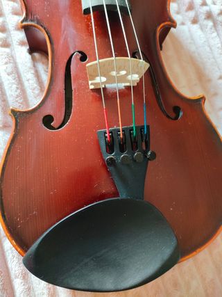 Modelo "Elite" Hecha en Rumanía. Estuche con paño protector. Dos arcos: uno cilíndrico y otro octogonal. Soporte plegable "Eastar" Dos juegos de cuerdas. Sordinas y resina. Sólo venta en persona.