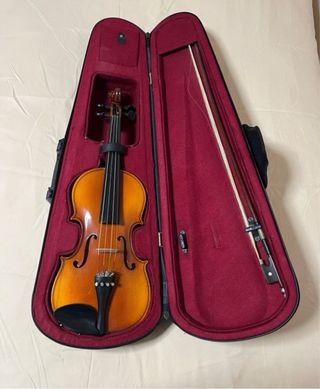 Violín de tamaño 1/4, ideal para los más pequeños. Incluye funda y arco para empezar a tocar. - Tamaño 1/4. - Incluye funda. - Incluye arco. - Incluye almohadilla de apoyo en hombro. - Lleva cuerdas para tocarlo como una viola. Ya que se ha utilizado como Viola. - con sólo cambiar 1 cuerda (se quita el do, se mueven de posición las tres restantes y añadimos la nueva mi, se convierte otra vez en violín) - o puedes cambiar el pack de cuerdas.