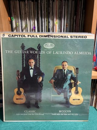 Álbum LP The Guitar Worlds de Laurindo Almeida. Edición 1962 made in USA. Capitol SP-8546. En muy buen estado. - Classic - Solos y duetos con la viola d'amour. - Modern - Duetos con la flauta y la viola. - Capitol Full Dimensional Stereo. - High Fidelity.