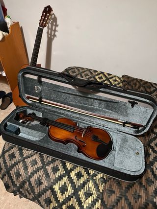 Violín bastante viejo, precio negociable. Creo que al menos para un principiante le puede servir. También se puede reparar y si cambias el arco y las cuerdas por unas básicas sonará mucho mejor. Se vende por inecesidad y para poder comprar uno más grande y profesional. Se vende a mano en Málaga. - Incluye estuche. - Incluye dos arcos. - Incluye apoyador de hombro (NUEVO). - Incluye una mantita que cubre el instrumento cuando está dentro de la funda.