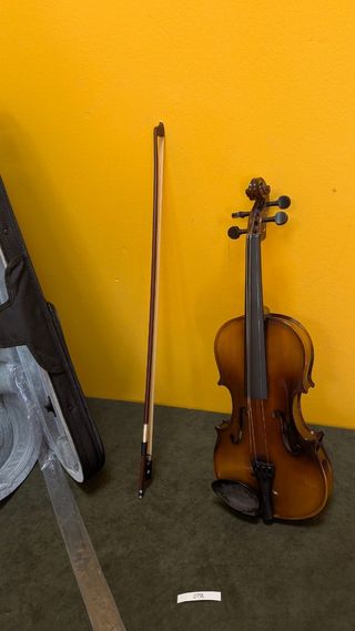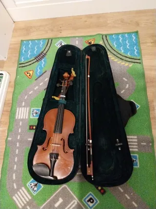 Violín de estudio tamaño 4/4 (estándar para adultos o jóvenes), ideal para iniciarse en el conservatorio o clases particulares. El instrumento está muy cuidado. El pack incluye: -Violín: Madera con acabado brillante, puente montado y cordal con afinadores de precisión para facilitar el afinado. -Arco -Estuche rígido: Interior de terciopelo azul con compartimento para resina y correas de transporte. Protege perfectamente de golpes y cambios de temperatura. de tamaño adulto (4/4) listo para usar.Violín de estudio en perfecto estado. Incluye todo lo necesario para su transporte y cuidado.