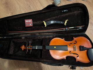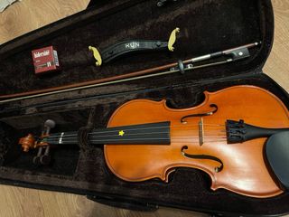 Se vende violín completo, listo para tocar. Incluye todo lo necesario para su conservación y uso. Perfecto para principiantes o expertos - Violín de madera con acabado brillante. - Estuche rígido azul con interior aterciopelado. - Dos arcos, de madera y de carbono con crin natural. -Dos resinas para los arcos. -Silenciador para violín. -Apoyador de hombros para violín.