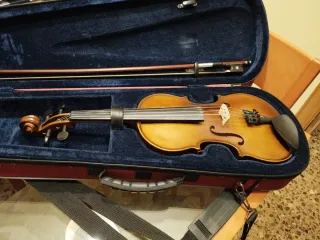 Completamente nuevo a estrenar. De madera maciza, no laminada. Clavijas, mentonera y diapasón de ébano. Cuerdas Pirastro Tonica. Con estuche, arco y almohadilla o costilla.
