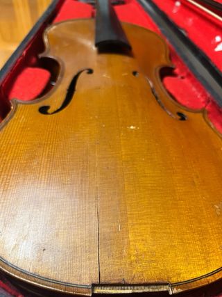 Violín antiguo que necesita restauración. Ideal para coleccionistas o luthiers. - Cuerpo de madera con acabado envejecido. - Incluye estuche y arco. - necesita reparación en botón.