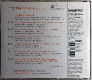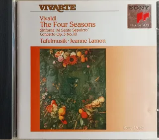 Hermosa versión de las cuatro estaciones de Vivaldi, interpretada por Tafelmusik con la dirección al violín de Jeanne Lamon. Especialmente reseñables los adornos de la solista en los movimientos lentos. Incluye la Sinfonía Al Santo Sepolcro y el Concerto Op. 3 No. 10. Regalo con él mi backup de las 6 sonatas para violonchelo de Geminiani, interpretadas por Anthony Pleeth, Richard Webb y Chistopher Hogwood. Un euro menos comprando 3 CD's o más. Las fotografías forman parte de la descripción. Agrupe artículos para reducir portes. Más discos, sellos, libros, monedas y otros artículos de colección en mi perfil. (antiguo, barroco, v
