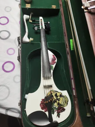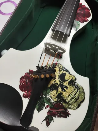 Violín de 5 cuerdas con un diseño llamativo. - Cuerpo blanco con detalles de rosas y calavera. - Estuche forrado en terciopelo verde. -Arco blanco a juego. -Madera italiana buena, no de las chinorris. Se le procuró una modificación para poder subir y bajar el volumen. Incluye entrada Jack. Es pasivo. Suena muy bien.