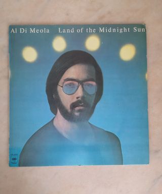 Disco de vinilo del álbum Land of the Midnight Sun de Al Di Meola. - Tipo de Música: Jazz fusión. - Lanzamiento: Fue el álbum debut en solitario de Al Di Meola, lanzado en 1976. - Contenido: El álbum incluye piezas complejas como "Suite-Golden Dawn", un dúo acústico con Chick Corea en "Short Tales of the Black Forest", y una breve sonata de violín de Bach, mostrando el rango de Di Meola.