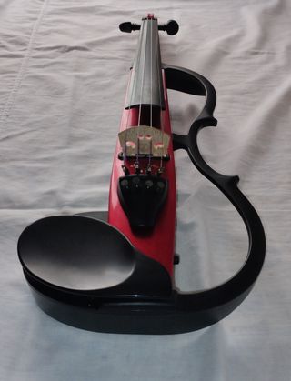 Se vende violín electrónico en color rojo, ideal para practicar y para actuaciones. - Incluye funda protectora. - Viene con arco para tocar. - Diseño moderno y ligero.