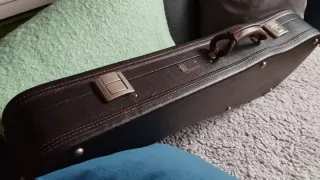 - Sin uso. Pequeños signos de desgaste por traslados y almacenamiento - Exterior marrón oscuro símil piel, con costuras vistas - Interior forrado en terciopelo rojo - Cierres metálicos y asa original - Compartimento interior para accesorios Incluye: - Colofonia Hidersine 1V (sin abrir) y Paganini, 2 cuerdas y sordina. Medidas: 85x26(parte más ancha) x12 cm.
