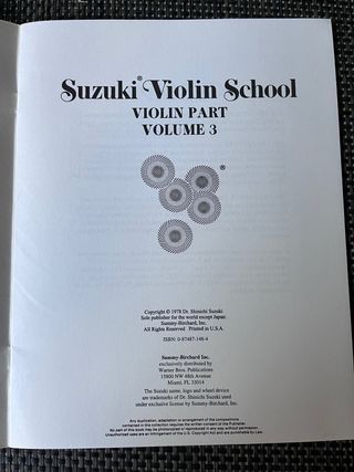 Libro de partituras para violín, volumen 3 de la Suzuki Violin School. - Incluye el método Suzuki. - Publicado por Suzuki Method International. ISBN 0874871484 sin utilizar