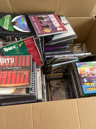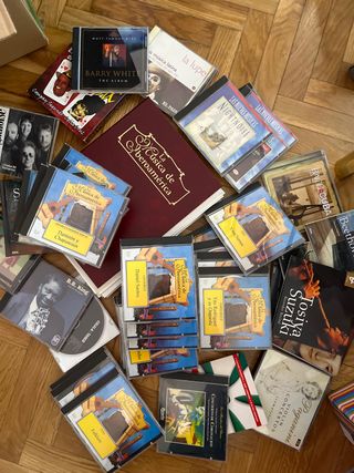 Colección de CDs de música con diversos géneros. - Incluye artistas como Barry White, B.B. King, Yma Sumac. - Contiene música latina, clásica, flamenco y más. - Títulos visibles: La Música de Iberoamérica, Las Nuevas Músicas, Paganini Violin Concertos, Tosiya Suzuki Recorder Recital, Cigala Tango, Folklore, Concierto de Coronación, entre otros. - Caja con varios CDs. Musica clásica, la tina, española e internaciona. Solo para recoger en zona Pinar de Chamartin