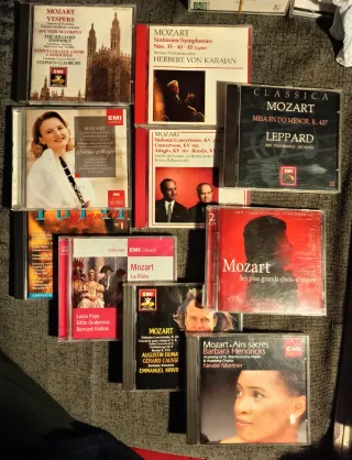 Colección de CDs de música clásica de Wolfgang Amadeus Mozart. - Vísperas, Vespers Cleobury - Sinfonías Nos. 35, 40, 41 BPO Karajan - Concierto para Clarinete KV 622 sinfonía concertante kv 297 Sabine Meyer-Vonk - Misa en Do menor, K. 427 Leppard - Sinfonia Concertante KV 364 Oistrakh - Nuevo precintado La Flauta Mágica selecc Haitink - Sinfonia Concertante K. 364 y conc violín n.3 Dumay - Airs Sacrés Bárbara Hendricks - 2CD Virgin Mozart obras maestras -Mozart Tutti EMI