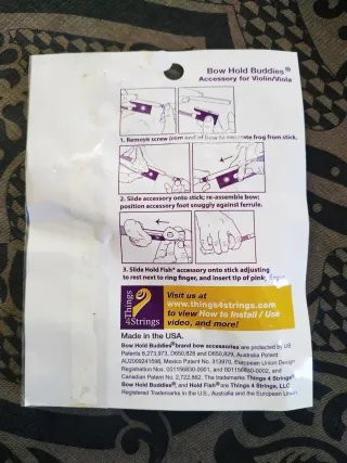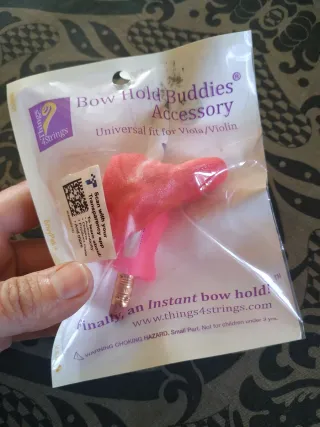 Accesorio Bow Hold Buddies para mejorar la sujeción del arco en violín o viola. Es la marca original, fabricado en USA. Muy buen estado, apenas usado un mes. Es un ajuste universal que consta de dos piezas (una rana y un pez), muy práctico para aprender a coger mejor el arco. De color rosa (sparkly pink). Entrego limpio y con el packaging original. Sólo hago envíos y sólo por Correos (no GLS ni InPost, ni entrega en mano, por favor).