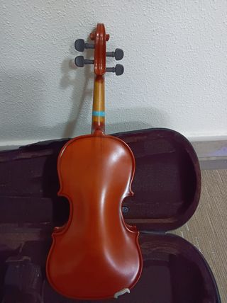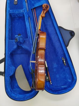 Violín completo listo para tocar, con su estuche y arco. - Violín de madera con acabado brillante. - Estuche azul forrado de terciopelo. - Arco de madera con crin natural. Es un violín stentor student I, en perfecto estado, con funda y arco