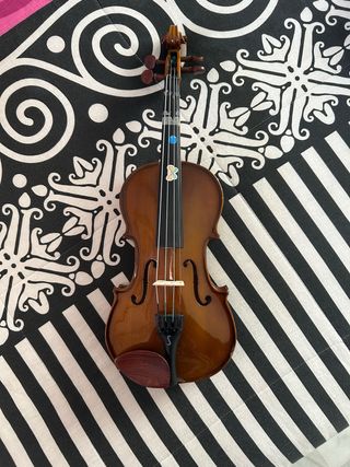 Vendo violín en muy buen estado, solo tiene una cuerda rota. Incluye arco y estuche. - El violín es de color marrón claro. - El estuche es de color verde oscuro, con un interior beige. - El arco está en buenas condiciones. - Incluye muchas partituras para empezar. - Sus medidas son: 55cm de largo y. 18cm de ancho en su parte más ancha.