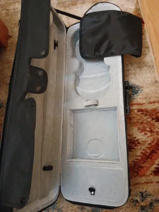 estuche rígido para violín de tamaño 3/4 con compartimento interior. Exterior de tela negra e interior forrado de tela suave. tiene asa y correa para colgar a la espalda. Tiene dos cremalleras que funcionan, a una le falta el metal para tirar.