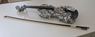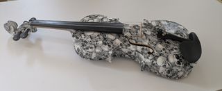 Violín macizo con diseño inspirado en calaveras Tapa de pícea maciza Fondo y aros de arce macizo Diapasón de abedul Clavijero, mentonera de Jujube Cordal con afinaprimas Incluye estuche, arco y colofonia