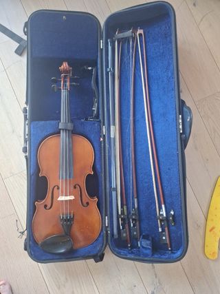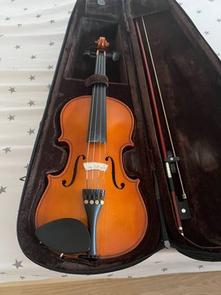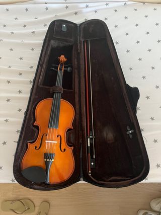 Se vende violín completo, listo para usar. Incluye todo lo necesario para empezar a tocar. - Violín de madera. - Estuche rígido marrón. - Arco. - Respaldo para el violín.