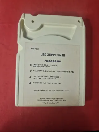 Cartucho de 8 pistas del álbum Led Zeppelin III. Cinta como nueva muy buen funcionamiento y sonido excelente. - Publicado por Atlantic Recording Corp. - Dirección: 75 Rockefeller Plaza, New York, New York 10019. - Número de catálogo: M87201. - Código de serie: S 104162.