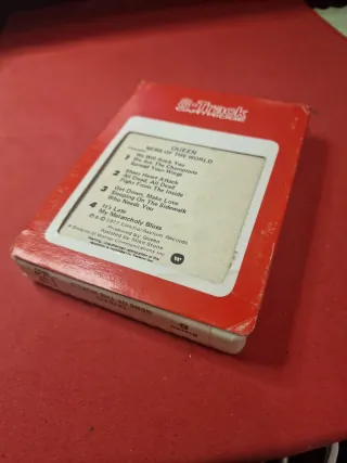 Cartucho de 8 pistas del álbum News of The World de Queen. Cinta en perfecto estado, buen funcionamiento y sonido excelente. - Fabricado por RCA Music Service bajo licencia. - Editado por Elektra/Asylum/Nonesuch Records. - Número de catálogo: ET8 112. - Referencia: S 134355.