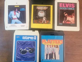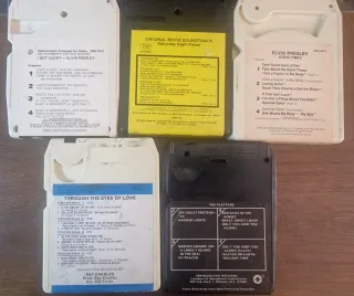 Lote de 5 cartuchos de 8 pistas con música variada. En muy buen estado. Funcionando prfectamente - Elvis Presley: I Got Lucky - Elvis Presley: Good Times - The Saturday Night Fever (Banda Sonora Original) - Ray Charles: Through The Eyes of Love - The Platters