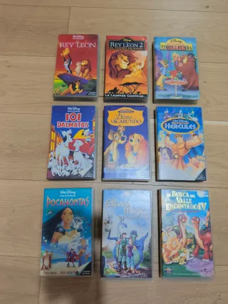 Lote de 9 películas VHS Disney y Warner Bros. - El Rey León - El Rey León 2 - Timón y Pumba - 101 Dálmatas - La Dama y el Vagabundo - Hércules - Pocahontas - La Espada Mágica -En Busca del Valle Encantado