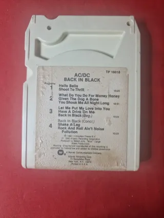 Cartucho de 8 pistas del álbum Back In Black de AC/DC. Funcionamiento y sonido excelente - Mfd. by RCA Music Service under License. - Atlantic Recording Corp. - TP 16018 - S 113772 - Año 1980 U.S.A.