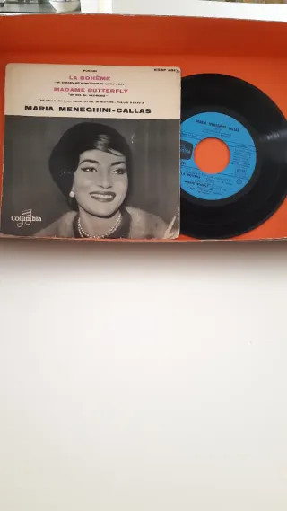 Disco de vinilo con interpretaciones de Maria Callas. - Incluye arias de La Bohème y Madame Butterfly. - Mi chiamano Mimì / Donde lieta uscì - Un bel di, vedremo - Orquesta Philharmonia, dirección Tullio Serafin. - Sello Columbia.
