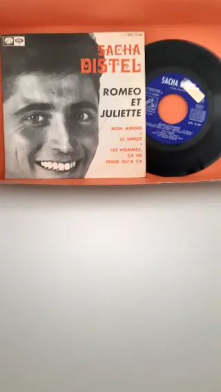 Disco de vinilo de Sacha Distel con las canciones Romeo y Julieta, Non Amore, Le Sifflet y Les Hommes, Ca Ne Pense Qu'a Ca. - Portada con retrato del artista. - Incluye las siguientes canciones: Romeo y Julieta, Non Amore, Le Sifflet, Les Hommes, Ca Ne Pense Qu'a Ca.