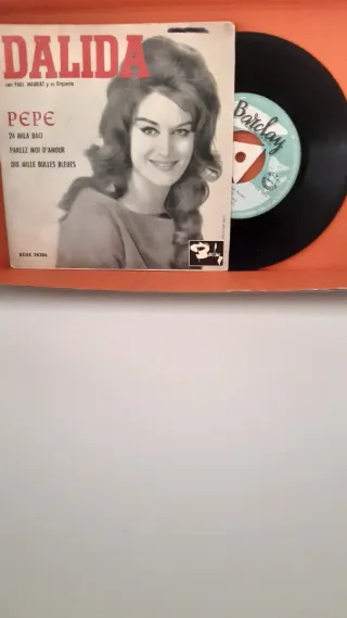 Disco de vinilo de Dalida con el tema Pepe y 24 Mila Baci. - Canciones incluidas: Pepe, 24 Mila Baci, Parlez moi d'amour, Dix mille bulles bleues. - Acompañamiento de Paul Mauriat y su Orquesta. - Sello discográfico Barclay.