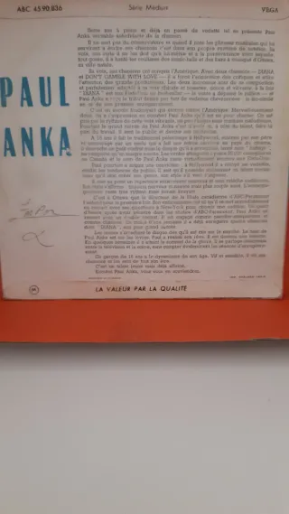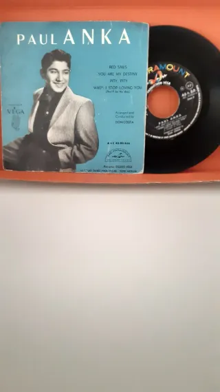 Disco de vinilo de Paul Anka con canciones clásicas. - Lado A: Red Sails, You Are My Destiny - Lado B: Pity, Pity, When I Stop Loving You (That'll be the day) - Producido por Disques Vega. - Arreglos y dirección de Don Costa.