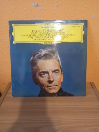 Disco de vinilo de música clásica. - Compositor: Peter Tchaikovsky. - Obras: Obertura Solemne 1812 Op. 49, Capricho Italiano Op. 45, Marcha Eslava Op. 31. - Orquesta Filarmónica de Berlín. - Director: Herbert von Karajan. - Sello: Deutsche Grammophon. - Referencia: Stereo 54999.