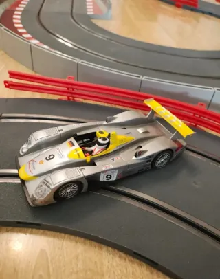 Pack de coches Audi R8 para Scalextric. Uno de los audi R8 le falta el alerón y los neumáticos le van algo justos, ambos funcionan perfectamente. Muy buen comportamiento sobre pista. - Modelo de competición plateado con detalles en amarillo. - Número 9 en el frontal y lateral. - Incluye piloto con casco.
