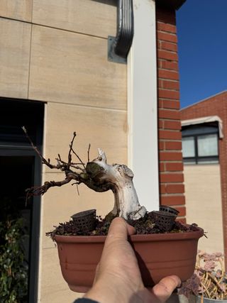 Precioso bonsái de manzano, ideal para coleccionistas o amantes de la jardinería. - Tronco principal con forma. - Maceta de terracota. - Dos cestas de drenaje visibles.