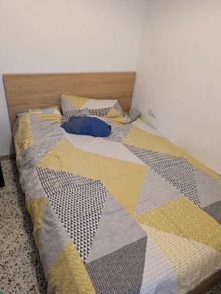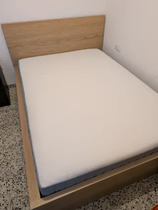 Se vende estructura de cama Malm en color beige, con un diseño moderno y limpio. Incluye somier de láminas, barra central metálica y el colchón Vesteröy. - En perfectas condiciones. - Solo se ha usado un ano.