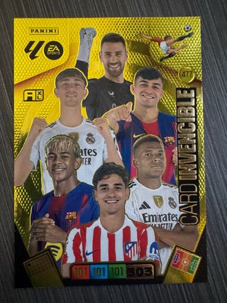 Carta Invencible de Adrenalyn XL. Recién sacada del sobre. Cambiamos por Lamine Yamal balon de oro 2026 o por algun balon de oro de la actualizacion. Sólo cambios en mano o venta con envío. - Diseño dorado con acabado brillante. - Ilustraciones de jugadores de fútbol. - Incluye números de estadísticas en la parte inferior.