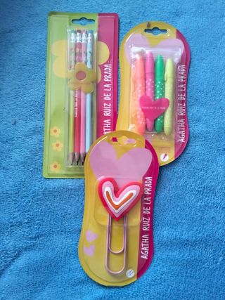 Conjunto de material de papelería de Agatha Ruiz de la Prada, compuesto. Nuevo, sin estrenar. Las fotos forman parte de la descripción. Precio no negociable. Envío a cargo del comprador. - Lote de 4 lápices con diseño floral. - Pack de 4 rotuladores de colores vivos. - Un clip de papel con adorno de corazón.