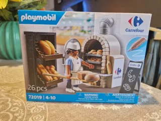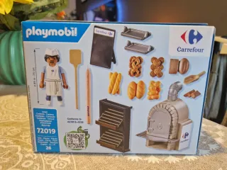 Set de Playmobil de la panadería Carrefour, modelo 72019. - Incluye 26 piezas. - Recomendado para edades de 4 a 10 años. - Advertencia: Riesgo de asfixia por piezas pequeñas. No apto para menores de 3 años. Completo sin abrir.