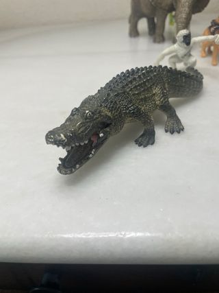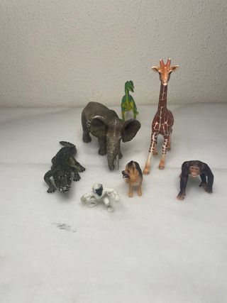 Conjunto de figuras de animales salvajes y un dinosaurio. - Incluye elefante, jirafa, cocodrilo, perro, chimpancé, humano y dinosaurio.