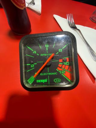 Cuenta revoluciones para Derbi FDX. - Modelo electrónico. - Marca CEV. - Diseño en negro con detalles en verde y naranja.