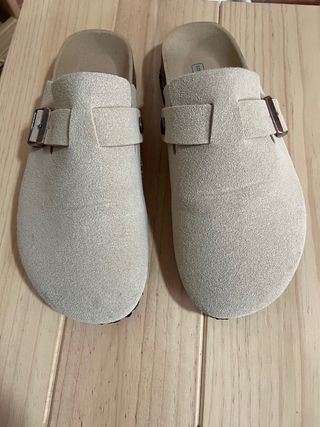 Zuecos cómodos de color beige clarito. - Diseño tipo zueco. - Correa ajustable con hebilla.