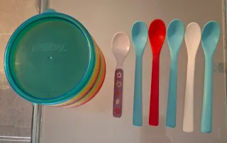 Set de recipientes apilables con tapa y varias cucharas. - 5 recipientes de colores apilables marca Nuby. - 6 cucharas de diferentes colores (azul, rojo, blanco) marca hippos.